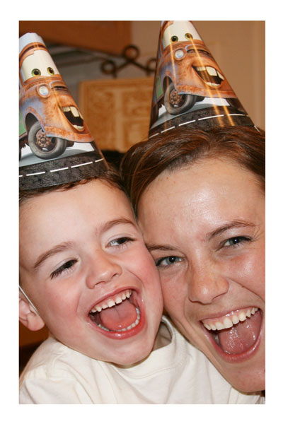 We had such a fun time at Brandon’s birthday party last night! We had a BBQ at Grandma Wendy’s house that was delicious–grilled and marinated turkey, grilled teriyaki salmon kebobs, augratin potatoes, a fruit platter, salad, and of course cake and ice cream. Yummy stuff. Grandma had decorated the house with all sorts of Cars paraphernalia which Brandon just loved. We played outside a little bit because it was pretty warm, had the huge bubble machine going, and just relaxed and enjoyed ourselves. We missed those who couldn’t be there. Brandon got TONS of fun presents for his birthday, everyone was so generous. Now we just need a toyroom built onto our house today!! 🙂 No, really.