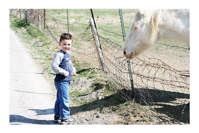 (Yes, a cheesy title. I know. Oh well.) There is a farm/field north of our house and they have some horses in a pasture that we drive past almost every day. So after Annie’s nap yesterday afternoon we decided to go on a walk to see the horses. It was such a nice day and we needed a change of scenery so off we went. When we got to the fence the horses came right over and hung out with us which thrilled Brandon and Annie. Of course I had my trusty Rebel so took tons of pictures. There’s a great long dirt road that was perfect for running and letting out energy (and getting cute shots of the kids). So here are some of my favorites: