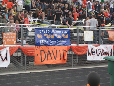 There were lots of people, a little “parade” around the track (hee hee), performances by various Murray High groups (choirs, band, dance, cheerleaders, etc) and a few presentations by local and state leaders. David seemed a bit tired and flustered by the attention (who could blame him–he had a full day!!) but genuinely grateful to the fans and very humble. He sang a few songs and his voice really is so clear and pure. He’s a very talented kid. There were too many people to get a good picture of David, but that’s okay. So, look for us on American Idol tonight! Ha ha! It’ll be fun to see who wins next week. I also like David Cook so who knows…