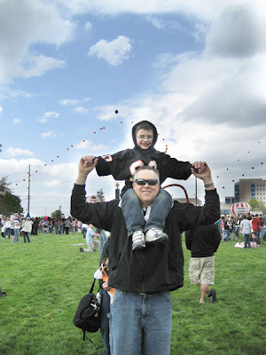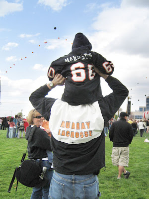 It was a cool, potentially rainy day, but we got our orange and black colors on anyway (MHS colors) and went to the football field with my parents (Jaden was out of town). There was loud music and balloons everywhere, and the kids had fun. Annie kept dancing and saying “Everyone is so happy!” Brandon wore my little brother’s old football jersey. Too cute. I wore my little brother’s OLD faded MHS football hoodie because I had forgotten my own stuff, it was really attractive. 😉 I should’ve gotten out my old student government sweater huh. Um….no!! Haylie was cozy and slept in the Snugli the entire time. I wish I would’ve brought my camera and my big ol’ zoom lens so we could see David better, but I didn’t want it to get rained on. At least we had Grandma Wendy’s camera to document the event. We had a good time.