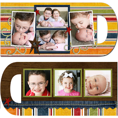 I used the “When Daddy Comes Home” digital kit at www.ggdigitaldesigns.com. I created the pages in Photoshop Elements 4.0, printed them at Costco, cut them out and adhered to some thin cardboard (the stuff that comes with your 12×18 prints when you get them at Costco), and cut out the cardboard to size. Punched holes and tied ribbons to bind together. Hooray! It’s a bit smaller than 6×12 inches in size.