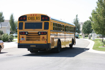 Waiting patiently for the bus to arrive. These two are the only ones at this particular pick-up for afternoon Kindergarten. There are several stops in our neighborhood. The bus would pick up more friends along the way!