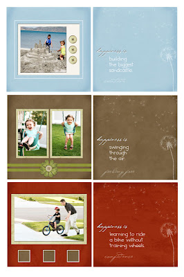 I made 5.5 inch x 5.5 inch layouts in Photoshop Elements 4.0, using all DSM products plus my own photos (except the “sweet kisses” photo was taking by Michelle Coleman.) I printed them at Costco and cut them out (I fit 6 layouts on each 12×18 inch sheet), then adhered to cardstock cut into 6×12 strips. I punched 2 holes in the middle and created a little booklet by tying with ribbon. Here are the pages that are inside. I just had little moments that made me happy from this summer. 🙂 You can click on the images to make them larger so you can read the writing.
